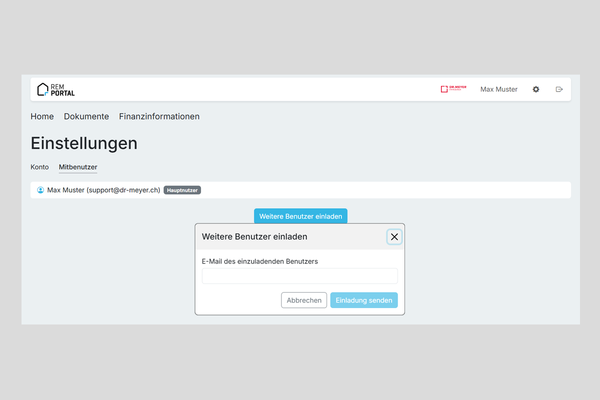 - Erfassen Sie die gewünschte E-Mail-Adresse und klicken Sie anschliessend auf «Einladung senden»